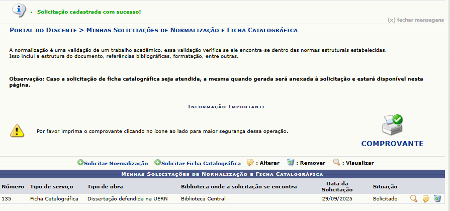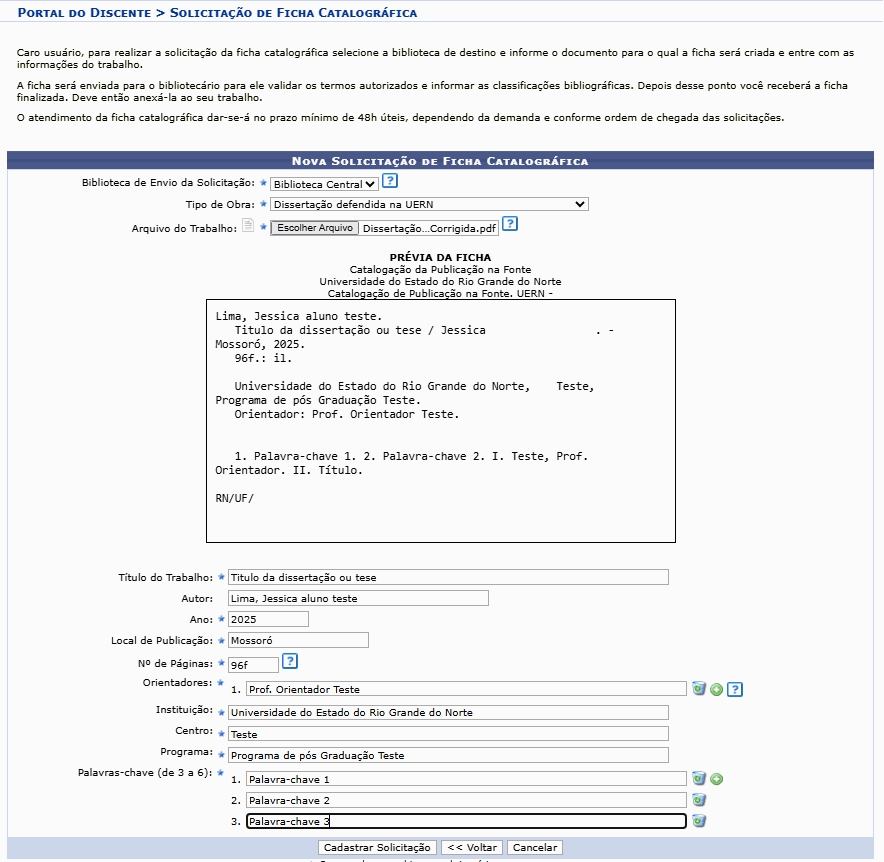 Com a versão corrigida do trabalho aprovada pelo orientador, o discente deverá solicitar a ficha catalográfica à biblioteca. A solicitação deverá ser feita através do seguinte caminho: