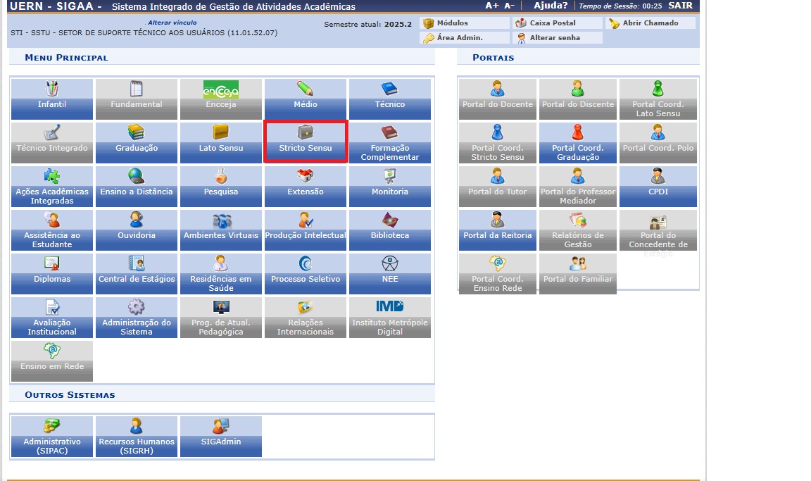 O secretário irá acessar o SIGAA, e procurar no Menu selecionando Stricto Sensu.