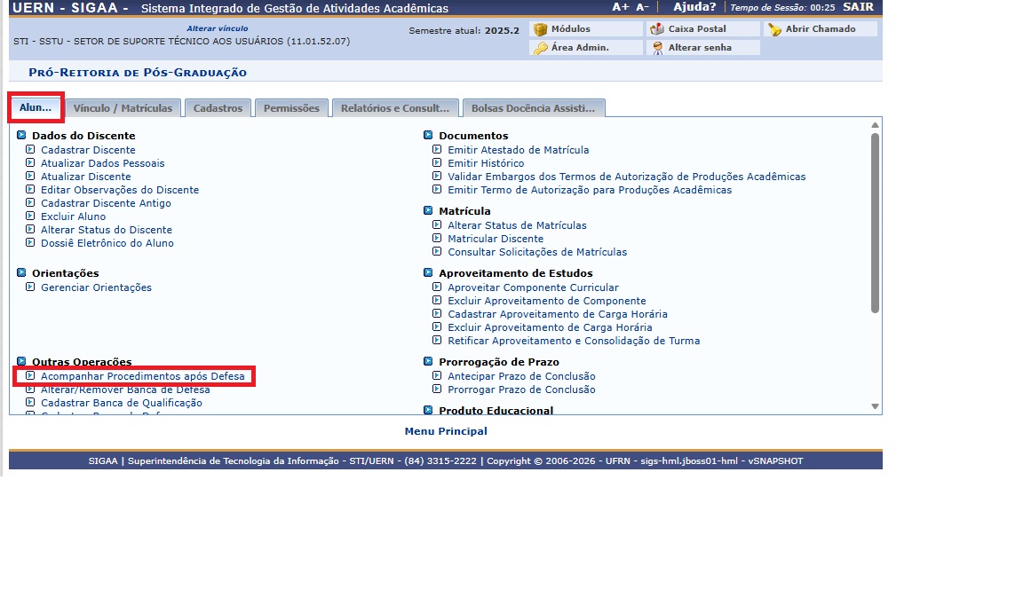 Na aba Alunos, busque em "Outras operações" a opção "Acompanhar Procedimentos após Defesa".