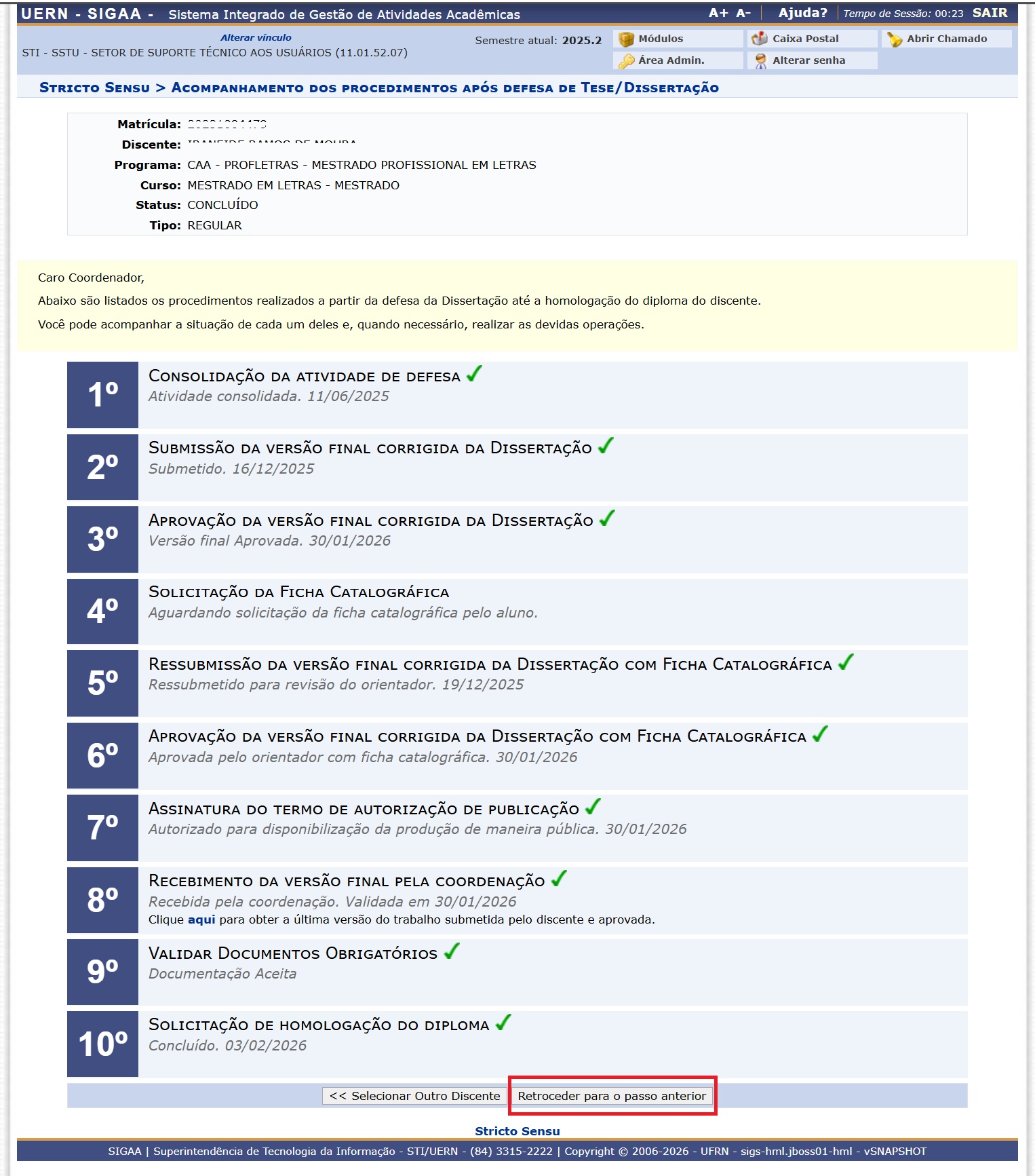 OBS: Se houver erro em qualquer fase, o secretário deve enviar um e-mail com os dados do aluno para a Secretaria da PROPEG solicitando que retroceda para o passo anterior.