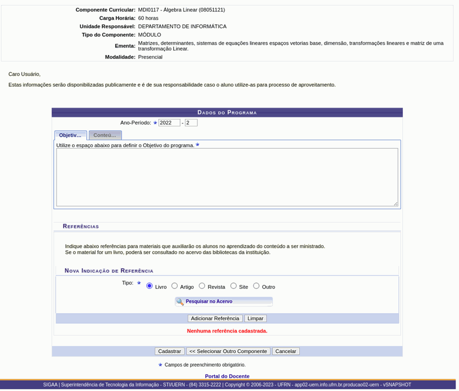Passo 5: Preencha os campos Objetivos, Conteúdo e Referências Bibliográficas. As referências bibliográficas inseridas no programa do componente curricular serão consideradas como "Referências Bibliográficas Básicas” de acordo com o PPC do curso.