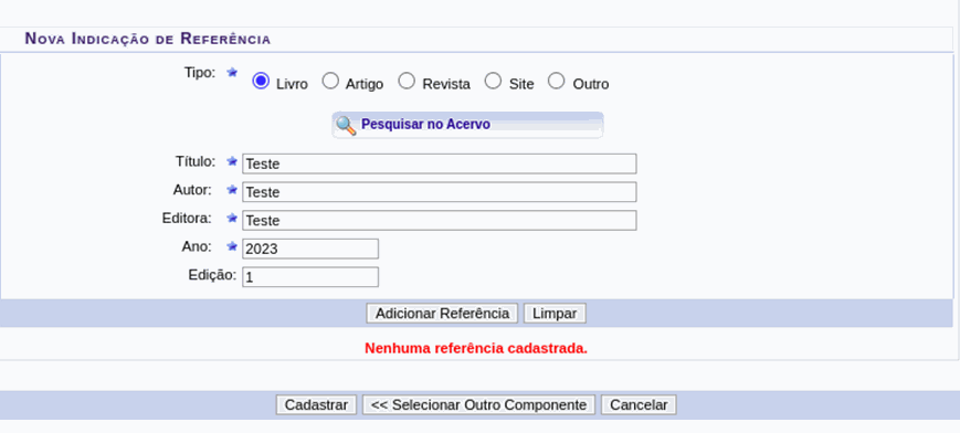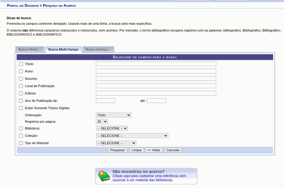Passo 6: O SIGAA permite a inserção do material disponibilizado no acervo, mas esse módulo ainda não está disponível. No entanto, é possível inserir a referência seguindo a tela : O coordenador ou chefe deve clicar em “Pesquisar no Acervo” e posteriormente clicar em “Não encontrou no acervo?”