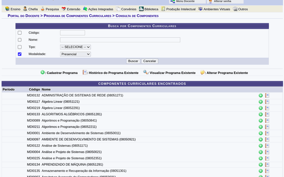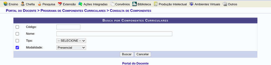 Passo 3: Selecionar o filtro desejado e clicar em “buscar”. Selecionando a modalidade Presencial, todos os componentes do departamento serão listados