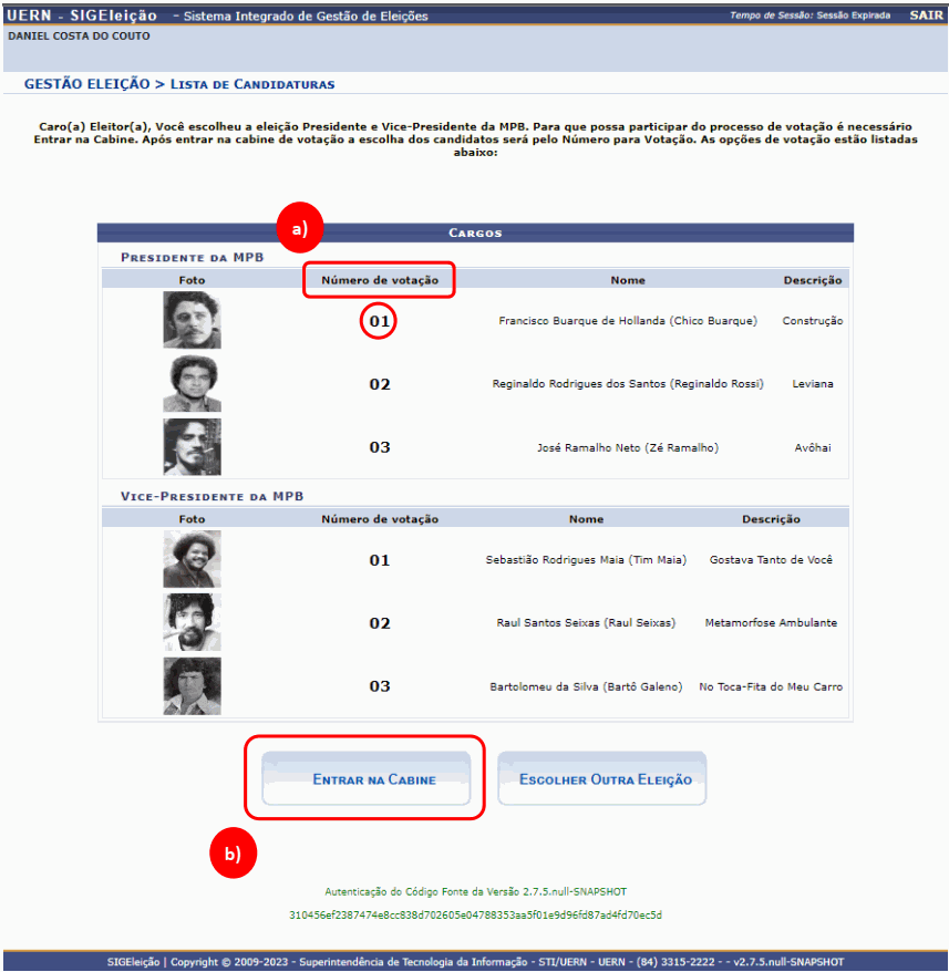 b) O eleitor deverá selecionar a opção “Entrar na Cabine” para iniciar a votação. O sistema exibirá a cabine de votação.