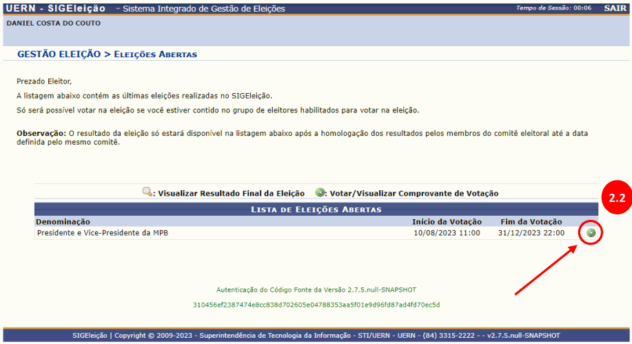 [2.2] Depois de acessar o sistema, será exibida a tela abaixo com as eleições disponíveis para o dia.