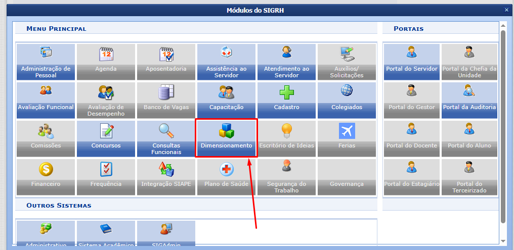 Siga por SIGRH >> Módulos >> Dimensionamento