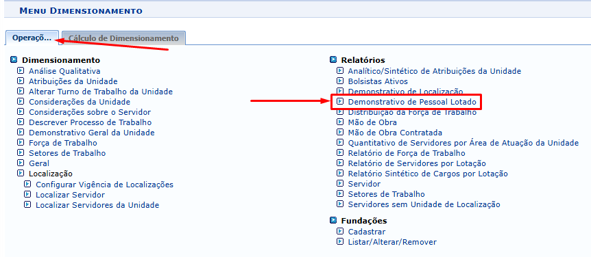 Em Operações siga por “Demonstrativo de Pessoal Lotado”