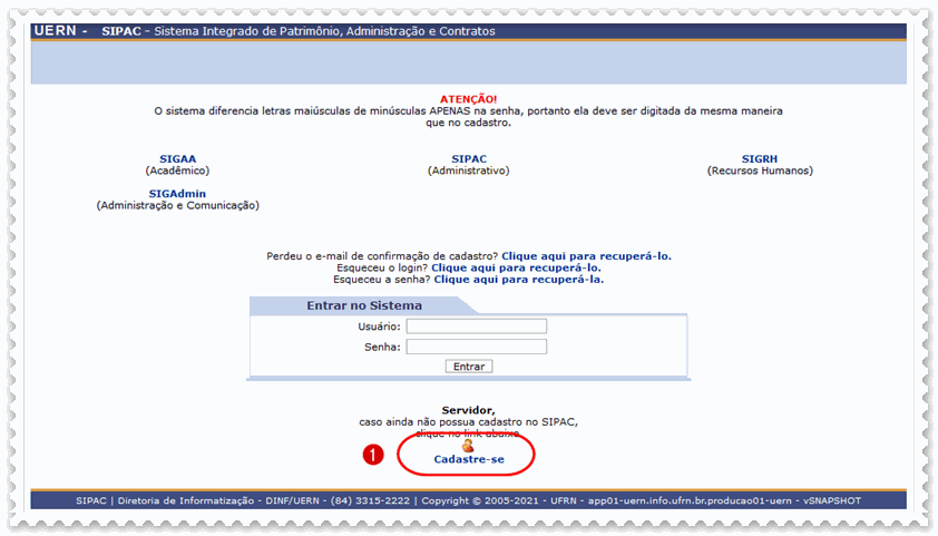 a) Acesse sipac.uern.br e clique em (1) cadastre-se;