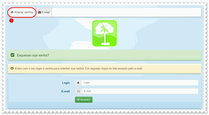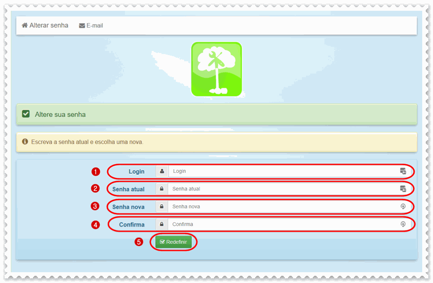 c) Informe o (1) login, a (2) senha atual, a (3) nova senha, (4) repita a nova senha e clique em (5) redefinir.